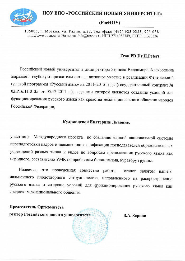 Благодарность РЦНК в Праге