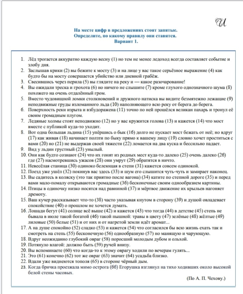 3 варианта по 22 задания в каждом для объяснения постановки запятых. В предложениях встречаются все случаи постановки запятых, которые есть в навигаторе подготовки от ФИПИ. В вариантах представлены примеры с разным количеством запятых. Поэтому задания подойдут для учеников как с высоким уровнем подготовки, так и с низким. Ответы предлагается занести в таблицу, по которой учителю будет легко проверить их.