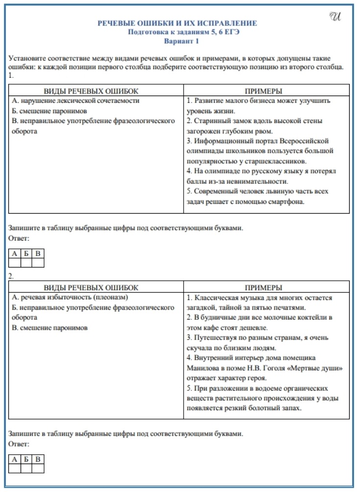 В пакет входят 3 варианта по 10 заданий на распознавание речевых ошибок, среди которых есть смешение паронимов, речевая избыточность (плеоназм и тавтология), речевая недостаточность, неправильное употребление фразеологизмов. Задание представлены в виде таблиц на соотнесение вида ошибки и ее примера.