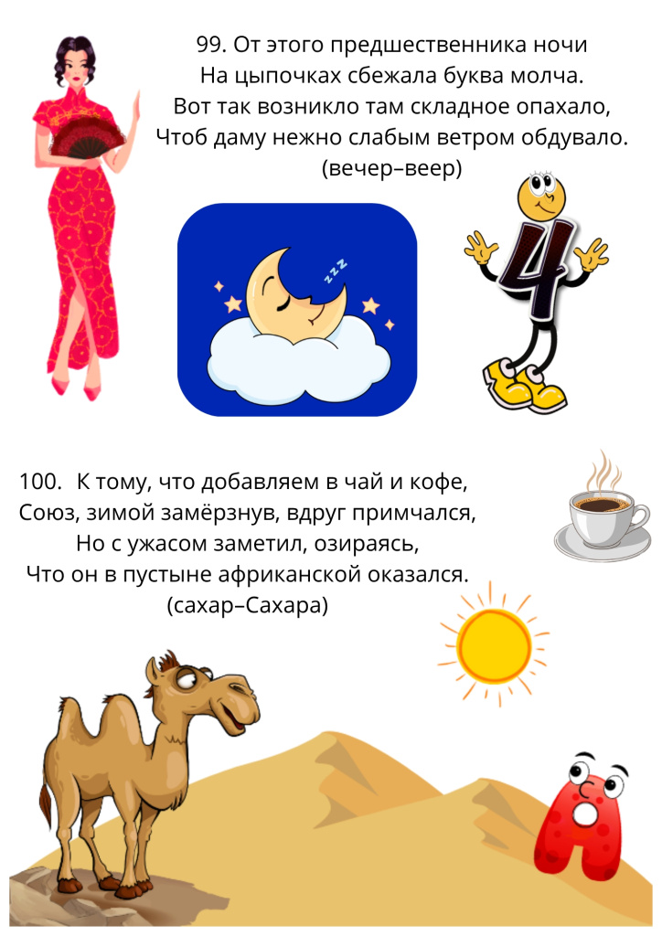 Нужно будет вспомнить названия стран, растений, животных, профессий и инструментов, поискать синоним к слову, припомнить названия арифметических знаков, падежи, а также сообразить, какой предмет гардероба надевает конь в холодный день.