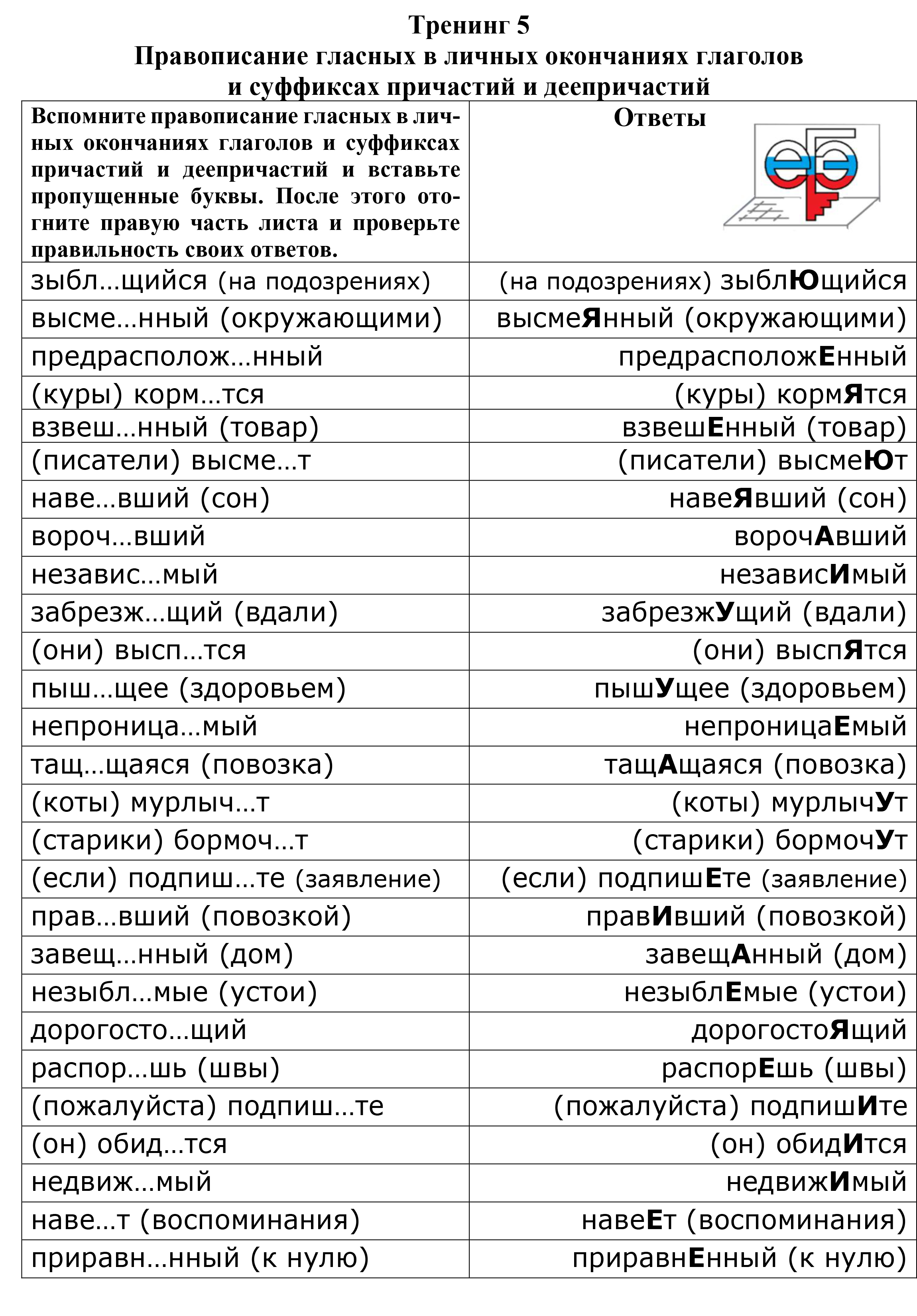 5 рабочих листов для тренинга в течение учебного года + ключи;