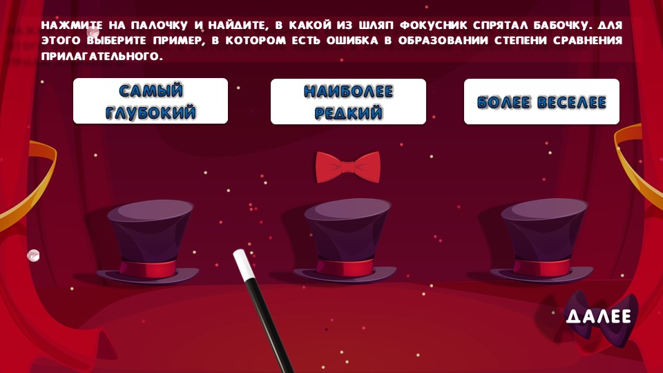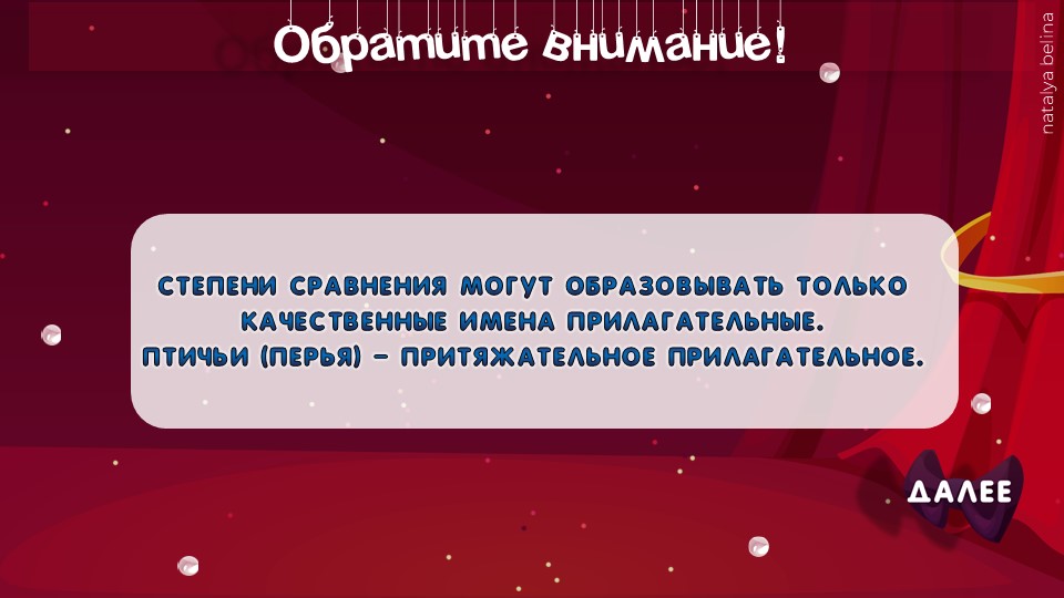 Игра-презентация выполнена в интерактивном формате с элементами игровой механики. Материал предназначен для изучения и закрепления темы «Степени сравнения имён прилагательных» в 6 классе. К презентации прилагаются методические рекомендации.