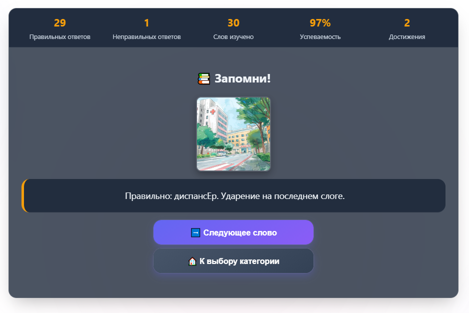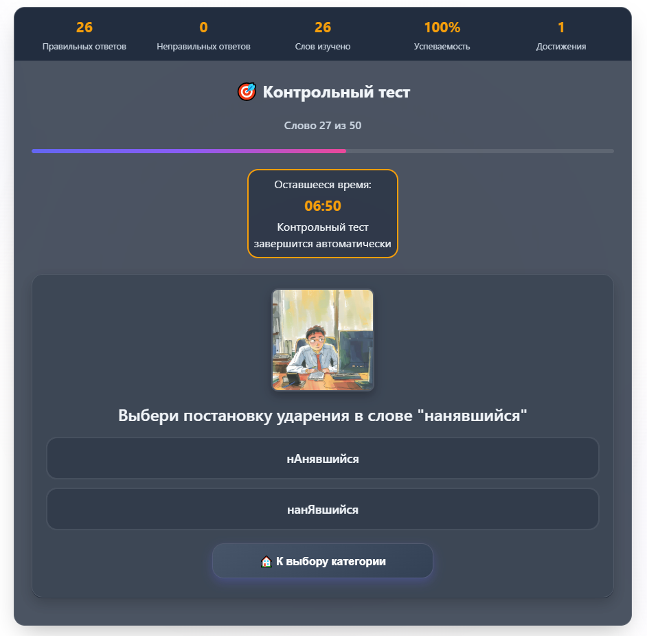 - Важная особенность: слова, в которых были допущены ошибки в постановке ударения, автоматически добавляются в конец очереди для повторного прохождения. Это означает, что фактическое количество слов в тесте может увеличиваться по сравнению с исходным. Пример: если в категории «Существительные» (65 слов) допущено 5 ошибок, общее количество заданий составит 70.