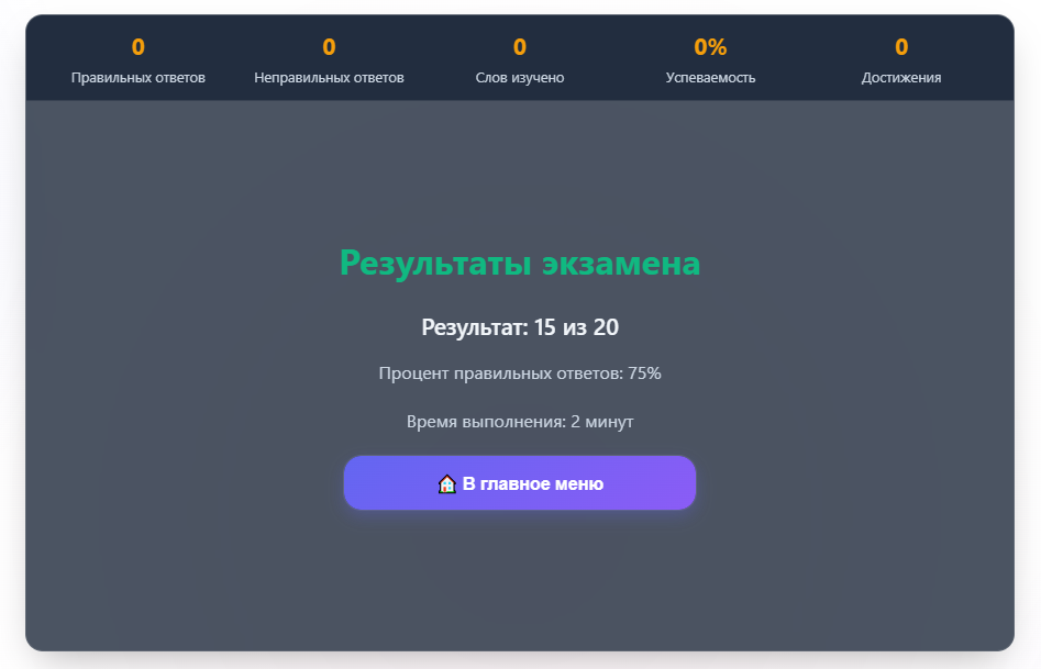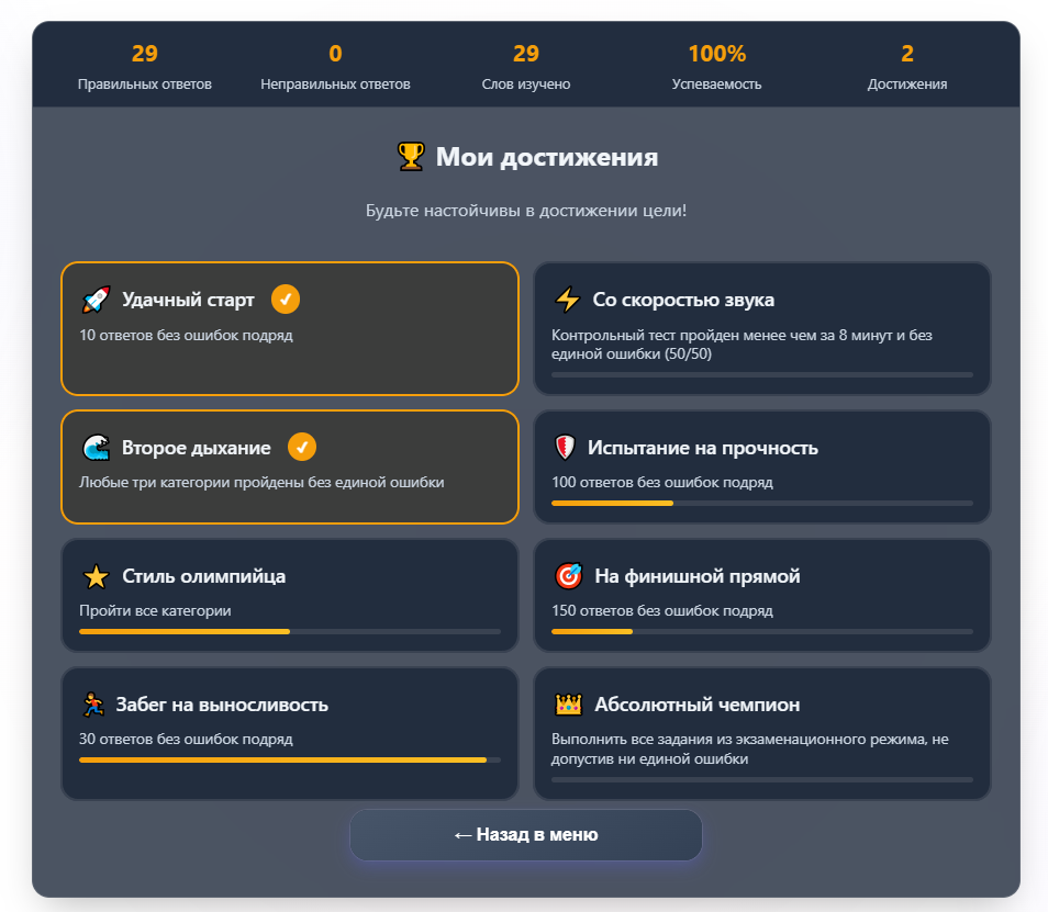 Важная особенность: данные экзаменационного режима не отображаются в общей статистике тренажёра. Однако учитываются для получения достижения «Абсолютный чемпион».